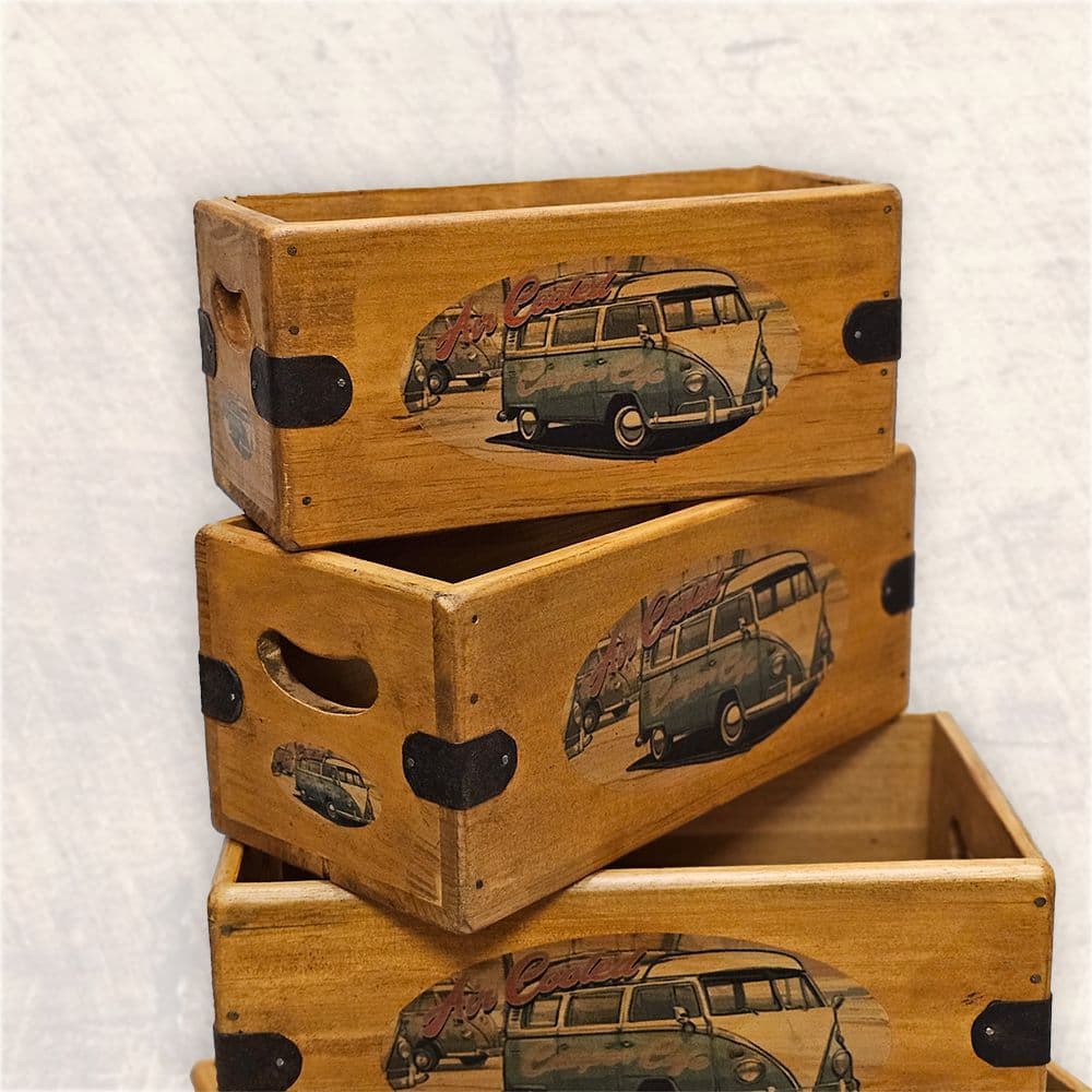 Handcrafted solid wood Camper Cafe Vintage Crate. Perfect decorative storage for air-cooled van enthusiasts, gifts, or hampers. Features rustic straps and a vintage finish. Four sizes available.